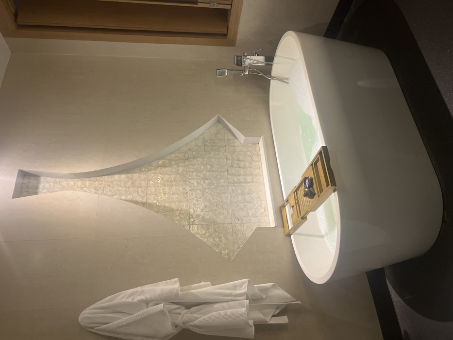 This image depicts a private bathroom in Patong, Thailand. A white, freestanding oval bathtub occupies the center of the frame, partially filled with light green, bubbly water, actively being dispensed from a chrome wall-mounted faucet and handheld shower combination on the right. A wooden bathtub caddy rests across the tub's rim, holding a small dark bowl with purple contents and a dark frog figurine. The walls are constructed of light beige tiles, with a prominent decorative recessed panel above the tub featuring a vertical, curvilinear, textured tile inlay, possibly composed of mother-of-pearl or similar reflective material. A white, waffle-weave bathrobe hangs on a hook on the left wall. To the far right, a wooden-framed window with shutters is visible. The floor is dark-tiled, providing a contrast to the lighter walls and tub. The room is brightly illuminated, highlighting the bath area and wall details.