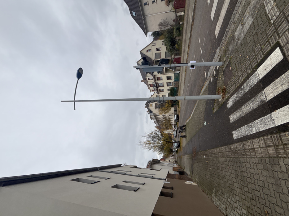 The image depicts a street scene in Strasbourg, France, under an overcast sky, suggesting autumn or winter conditions due to visible fallen leaves and partially bare trees. The vantage point is from a paved sidewalk on the left side of the street, looking down the road. In the immediate foreground, a multi-textured sidewalk composed of grey and reddish-brown interlocking pavers is visible. To the left, a building with an off-white upper facade and a dark brown lower section presents multiple rectangular windows. Centrally positioned, a tall grey metal streetlamp post with a curved arm and a dark ovular light fixture stands next to a secondary grey pole supporting a black traffic light unit and a pedestrian signal. Attached to the lower section of this pole is a small black box-like device with a white piece of paper affixed to it. A pedestrian crosswalk, marked by three weathered white stripes on dark asphalt, is partially visible in the lower right quadrant. Scattered dry, brown leaves are present on the sidewalk and road. The midground features an asphalt two-way street extending into the distance, with white road markings visible. Several cars are parked along the right side of the street. On the left sidewalk, multiple bicycles are parked. Mature trees, displaying yellow and orange foliage, line the left side of the street. Both sides of the street are bordered by multi-story residential buildings with various architectural details, including pitched roofs and multiple windows, some with balconies. Green hedges and low fencing are visible in front of some properties. The background shows the street curving slightly to the left, with additional buildings and trees receding into the overcast horizon. No individuals, animals, or discernible actions are present in the scene.