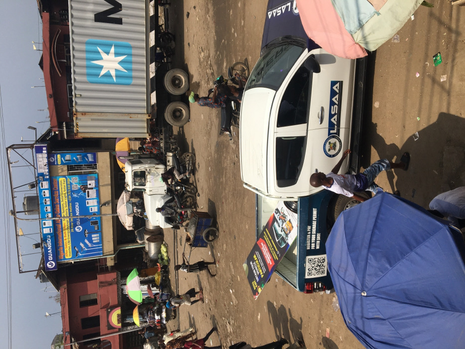 An outdoor scene shows a busy street with a mix of vehicles, pedestrians, and market activity. A large shipping container truck dominates the left side of the frame, parked near a building displaying "GUANGDU" signage. To the right, a white LASAA vehicle is parked with its rear door open, displaying a sign about signage permits. People are gathered around the vehicle. In the foreground, part of a blue umbrella is visible, suggesting a vendor's stall. The overall impression is a bustling commercial environment in a developing area.