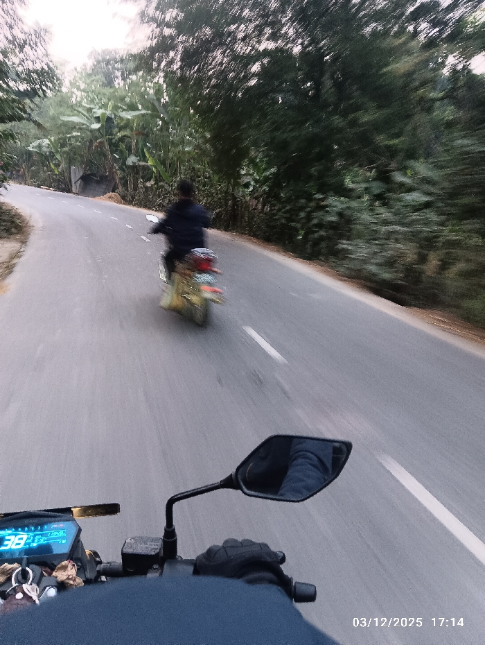 The image depicts a first-person view from a moving motorcycle in Kaliganj, Bangladesh, at 17:14 on March 12, 2025. In the foreground, the handlebars, digital dashboard displaying "38," and a rearview mirror of the photographer's motorcycle are visible. A gloved hand holds the right grip, and a dark blue garment covers the rider's lap. Keys with a small brown charm hang from the ignition area. The right mirror reflects a portion of the rider's leg, clad in blue. The midground features an asphalt road with a white dashed line, curving slightly to the left in the distance. Ahead, another individual rides a blurred, yellow-green scooter, also in motion, wearing a dark jacket. The background consists of dense, green foliage, including trees and prominent banana plants, lining both sides of the road, suggesting a rural or semi-rural environment. The lighting indicates late afternoon conditions.