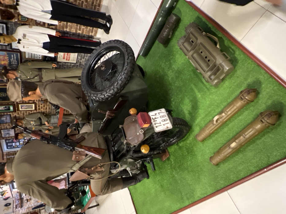 A diorama showcases a World War II-era motorcycle with sidecar and weaponry, possibly a German model