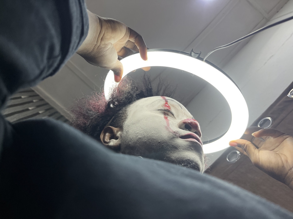A person wearing clown-like makeup lies under a ring light. The individual has a painted white face with red streaks around the nose and running down from the forehead. A hand above the face adjusts the light. Another hand reaches in from the right side of the frame. The person's hair is dark with red-tinged ends. The background suggests an indoor setting.