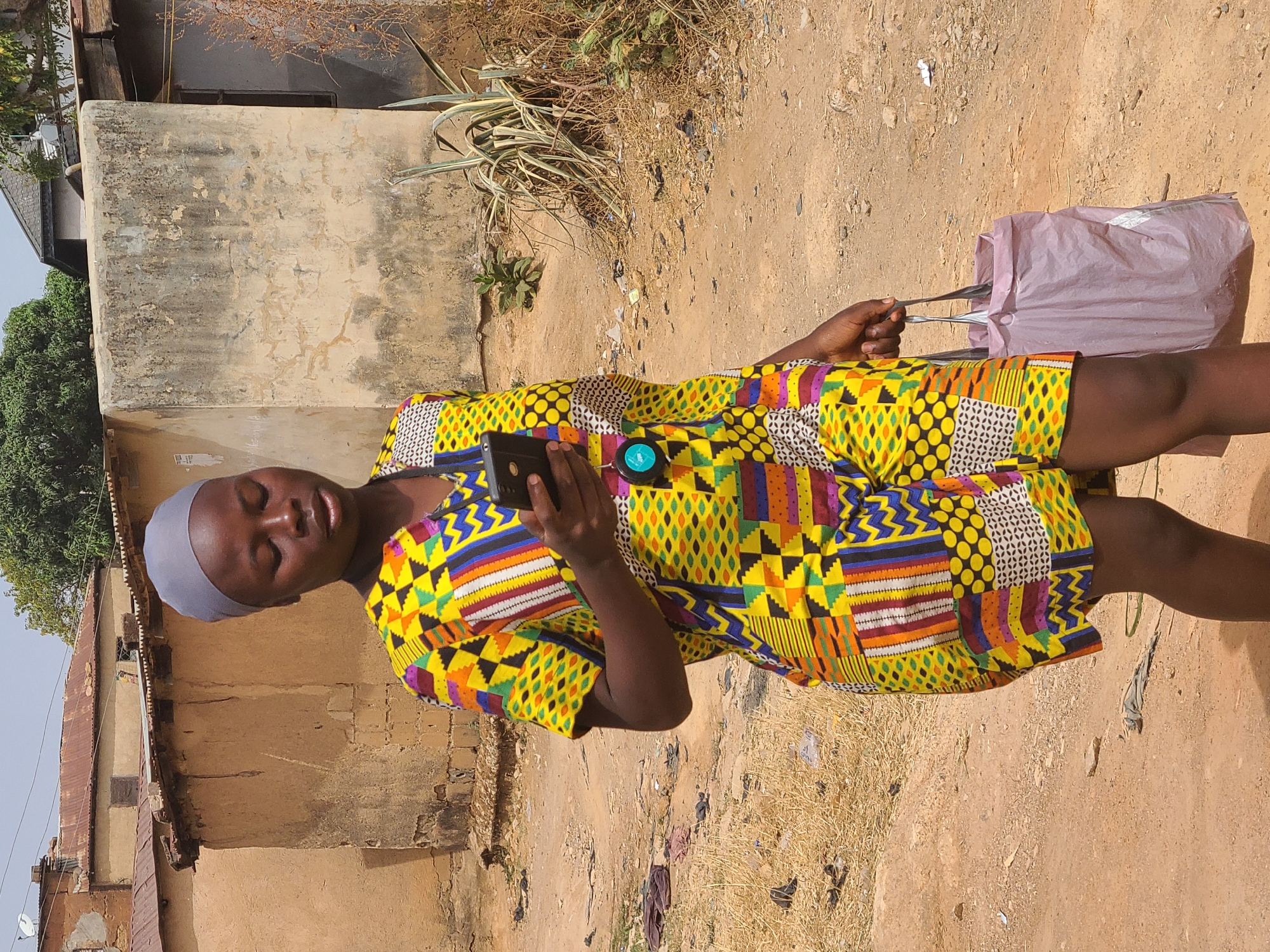 A young adult female is depicted walking on a dry, unpaved dirt road in Barakin Lerawi, Nigeria. She has dark skin, wears a grey headwrap, and a vibrant, short-sleeved dress featuring a multi-colored geometric pattern. A circular blue and black device on a lanyard is visible around her neck. She holds a black smartphone in her left hand, actively viewing its screen, with her eyes cast downwards. In her right hand, she carries a light purple plastic bag containing metallic utensils, likely spoons or forks, and possibly other items. The immediate environment consists of dry, reddish-brown earth with sparse dry vegetation and scattered debris, including discarded fabric and litter. In the background, several single-story structures are visible under a bright, clear sky. To the left, a building constructed of light brown mud or clay features a rusted corrugated metal roof. To the right, a weathered, rectangular wall of concrete or plaster shows discoloration, peeling, and dark biological growth. Behind this wall, additional buildings and a green leafy tree are partially visible. The scene is brightly illuminated by direct sunlight.