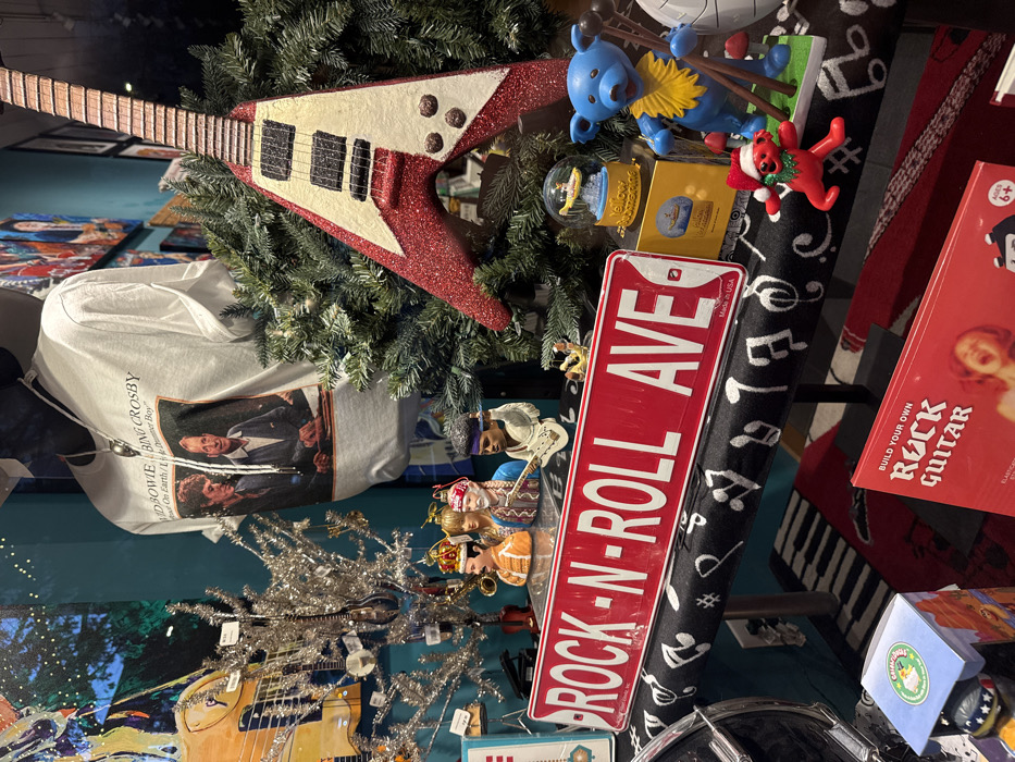 The image features an eclectic collection of items. A red glitter-covered, V-shaped guitar ornament is intertwined with green foliage. A t-shirt with a print featuring David Bowie and Bing Crosby lays underneath. A red "ROCK-N-ROLL AVE" sign rests among various figurines and toys, including a blue bear and a red character with a wreath. A "Build Your Own Rock Guitar" kit is also visible, against a musical-themed background with piano keys and music notes.