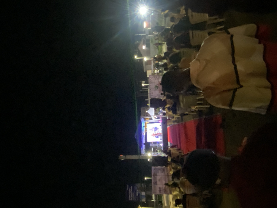 An outdoor night event with a stage illuminated by bright lights and a large screen