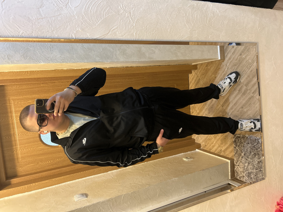 An image, captured as a mirror selfie, depicts a male individual standing indoors. The subject has a shaved head and wears dark sunglasses, a gold-colored chain, a black Nike tracksuit with white piping along the sleeves, a light-colored t-shirt beneath, and white and black athletic shoes. A gold-toned wristwatch is visible on the left wrist, and a beaded bracelet is on the right. The individual holds a smartphone with a dark case in the right hand, obscuring part of the face, while the left hand is placed inside the pocket of the track pants. The reflection shows an interior space featuring a light brown tiled floor, a small dark shaggy rug in the lower left, a light wood-paneled door with a circular glass insert behind the subject, and textured light-colored walls, one with a white light switch. This scene is located in the city of Ruse, Bulgaria.