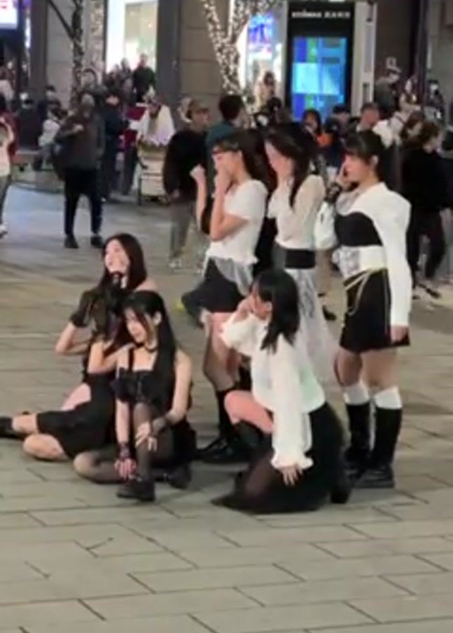 A group of nine young women pose for a photo or video in an outdoor pedestrian area. The women are dressed in a mix of black and white clothing with a somewhat uniform aesthetic. Some are standing, while others are kneeling or sitting. They seem to be the focus of attention as several people are watching and recording them. The background features shops and decorations, suggesting an urban commercial area. The scene suggests a planned or staged performance or photoshoot.