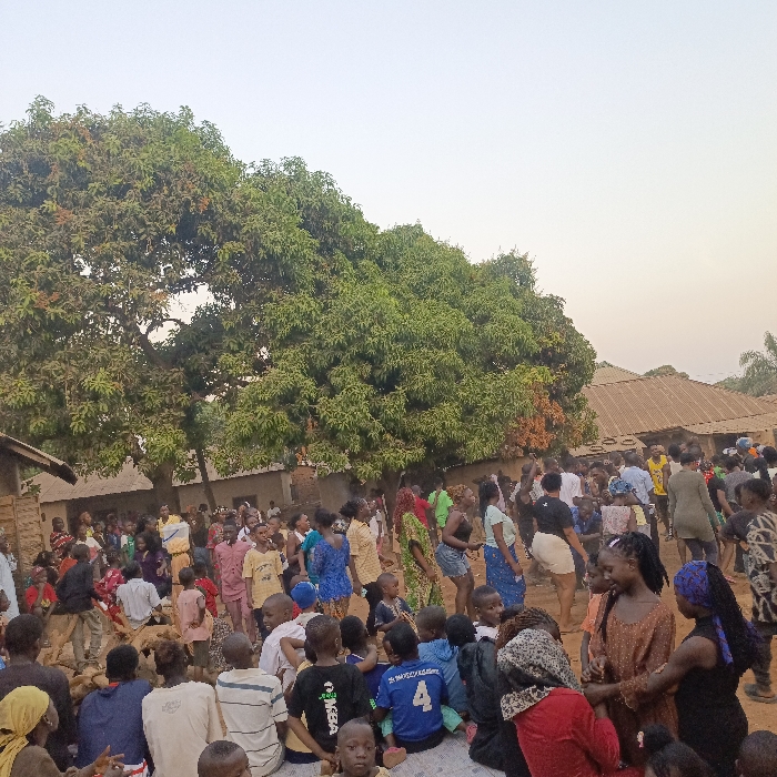A large group of people, mostly children, are gathered outdoors. The crowd is dense and diverse, with individuals sitting, standing, and interacting. Lush green trees provide a backdrop to the scene. Some buildings with corrugated iron roofs are visible in the background. The overall atmosphere suggests a community event or gathering, possibly in a rural area. The sky is light, indicating either early morning or late afternoon.