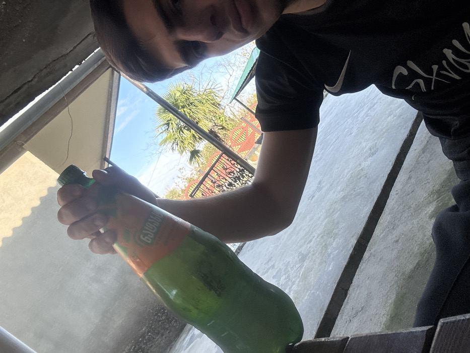 This image captures a close-up, angled view of a male individual in an outdoor setting within Bulishi, Georgia, on a clear day. The subject, visible from the mid-torso upwards, has short dark hair and is looking directly towards the camera. He is wearing a black short-sleeved t-shirt with a white Nike swoosh logo on the right chest area. His right arm is bent, holding a large, green plastic beverage bottle by the neck and body. The bottle has a green cap and an orange label with Georgian script ("ზედაზენი") visible, and condensation is present on its surface. The background features a bright blue sky with scattered clouds. Below the sky, palm trees and other leafless deciduous trees are visible. Behind the vegetation, a decorative metal fence or gate with red and black intricate patterns is present. A partial view of a structure with a green roof is seen beyond the fence. The upper portion of the frame shows a light-colored, textured wall or support structure, and a corrugated roof or awning extends from the top edge. A dark, possibly wooden, surface is visible in the bottom-left corner of the frame, suggesting the individual is seated at a table. The lower-mid background consists of a light-colored, textured ground surface, possibly concrete.