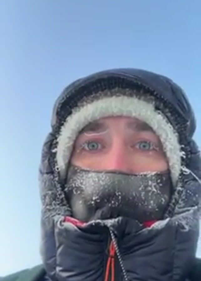 A man is facing the camera. He is bundled up in cold-weather gear; a black, puffy hooded coat, and a fuzzy, light-colored beanie. A black face covering is pulled up over his nose and mouth, and ice crystals have formed on the beanie, the coat, and the face covering. His eyes are blue. The background is a clear blue sky.