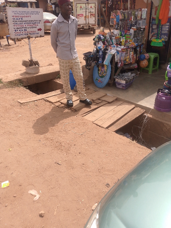 The image depicts an outdoor commercial scene in Jos, Nigeria, likely on a street or market thoroughfare. In the foreground, a prominent drainage channel or open gutter runs horizontally across the reddish-brown dirt ground. Sections of this drainage are covered with loose wooden planks, forming a makeshift walkway. One section of the channel to the right reveals discarded wires and debris. The lower right corner shows the front hood and headlight of a light-blue/teal vehicle. An adult male, appearing to be of African descent, stands facing slightly left of the camera's perspective, with his hands clasped behind his back. He wears a light-colored long-sleeved collared shirt, light-colored plaid trousers, dark shoes, and a dark red or maroon cap. His shadow is cast on the ground to his left, indicating strong overhead sunlight. He stands on the wooden planks bridging the drainage. To the man's left is a white rectangular signpost mounted on a metal pole, anchored by rocks and concrete. The sign reads: "JAY'S BUSINESS CENTER & INTEGRATED SERVICES" at the top, followed by a list of services: "PHOTOCOPY, CAFE, CAC COMPANY REGISTRATION, ONLINE REGISTRATION, TYPING & PRINTING, LAMINATING & BINDING, POS, LIGHT & TV RECHARGE, COMPUTER TRAINING." A red arrow points right from the "POS" entry. To the man's right, and extending into the background, is a street vendor's stall or shop entrance. This stall displays a variety of goods, including phone accessories (cases, chargers, cables), stationery items, cleaning supplies (brooms, brushes), and various plastic household goods (e.g., a green plastic stool, purple plastic baskets). A large, bright blue oval-shaped plastic item, possibly a children's toy or tray, leans against the stall structure. In the background, a silver-colored sedan is partially visible behind the signpost. Further back, a white truck with "FRESHGLOW" branding and a visible refrigeration unit is parked. Buildings with light-colored and brown facades line the street, suggesting a dense commercial or residential area. The ground throughout the visible area is unpaved, consisting of reddish-brown dirt with scattered small pieces of litter and debris.
