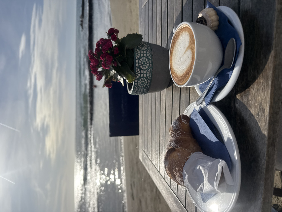 This image depicts a beachfront cafe setting in Anzio, Italy. In the foreground, a light brown wooden slatted table holds breakfast items. On the left, a white oval plate contains a croissant dusted with powdered sugar, partially wrapped in a white paper napkin, and resting on a blue paper napkin. To the right, a white ceramic cup with a cappuccino, featuring a heart-shaped latte art, sits on a white saucer with a small silver spoon and a small cookie-like pastry, all placed on another blue paper napkin. In the center-right of the table, a potted plant with clusters of small, deep pink flowers and green leaves is situated in a gray pot with a teal-colored, openwork patterned rim. Beyond the table, a sandy beach transitions to the calm Mediterranean Sea, visible under a bright, partly cloudy sky with discernible contrails. Sunlight reflects intensely off the water's surface, creating a sparkling effect. In the mid-distance on the beach, a dark rectangular object is partially visible, and further out in the sea, multiple dark structures resembling breakwaters or rock jetties are present. No individuals are visible within the frame.