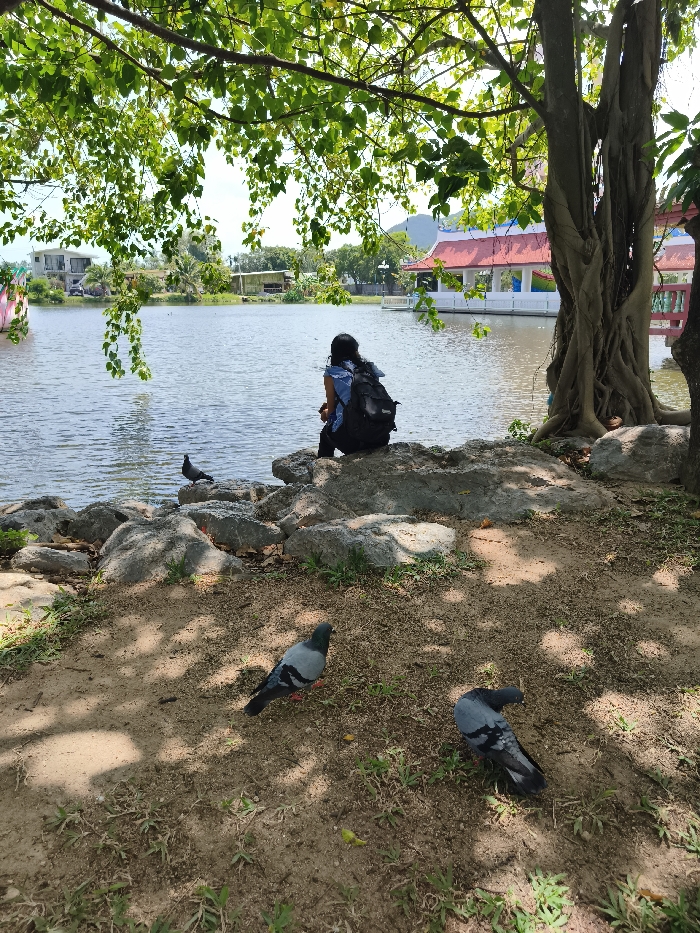A woman with a backpack sits on rocks by a lake, gazing at the water. A traditional Thai building with a red roof is visible across the lake. Three pigeons are on the ground nearby, basking in the sunlight filtering through tree branches. The scene evokes a sense of tranquility and peace in a natural setting.