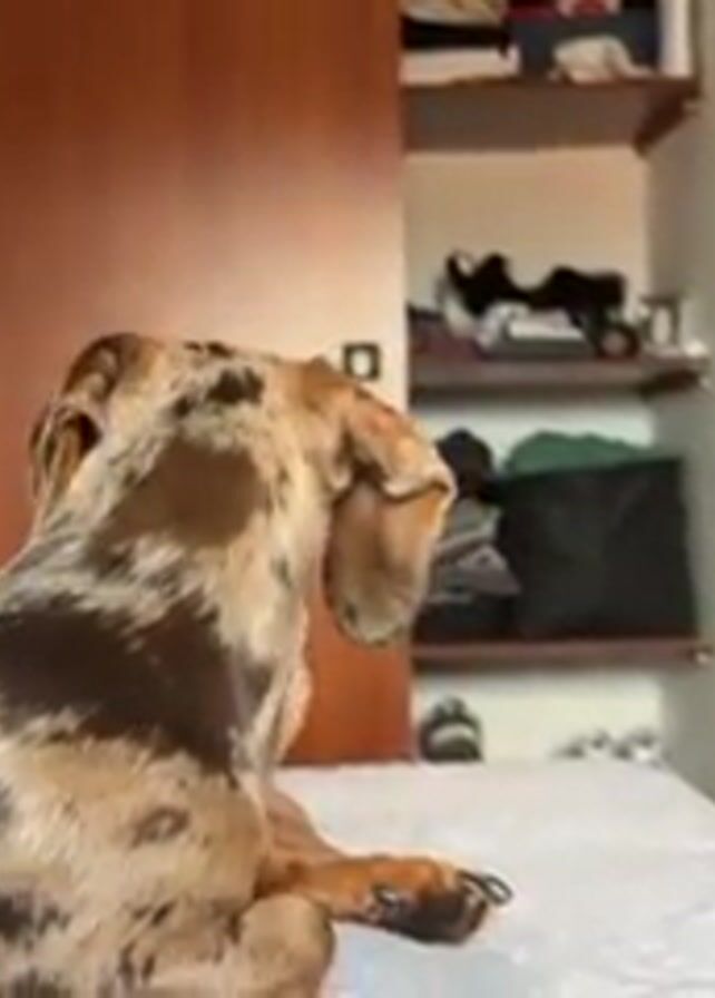 dapple dachshund lying on a bed. The dog is facing away from the camera at first, then turns its head and barks once. A foot is visible near the dog. In the background is a closed closet with shoes stacked on shelves, open shelves with various items, a mirror on a dresser, and a woven object.