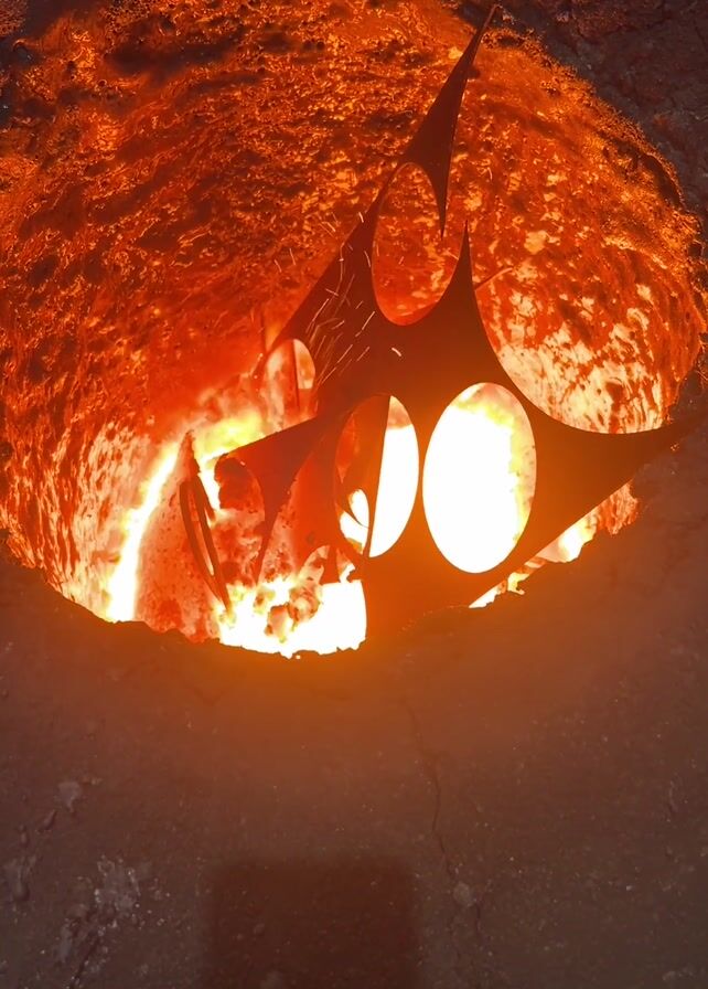 The scene shows a dark, deep pit with molten material glowing orange and white at the bottom. A dark, metal structure with triangular and circular cutouts is positioned above the molten material, partially obscuring the view. The edges of the pit appear rocky and cracked. The image is still, with no apparent movement.