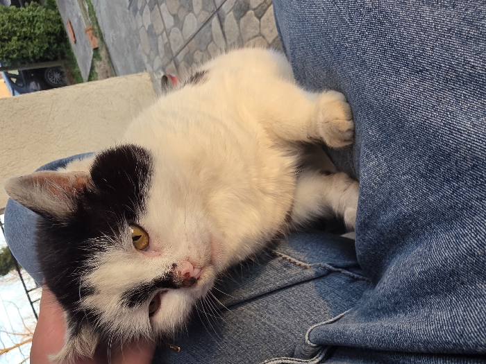 A black and white cat is depicted sitting on the lap of an individual clad in blue denim jeans. The scene occurs outdoors or in a semi-enclosed outdoor space within Staliyska mahala, Bulgaria. The cat, the primary subject, exhibits predominantly white fur with distinct black patches. A prominent black marking covers the left side of its head (from the viewer's perspective), extending over the left ear, around the left eye, and partially onto the forehead. Smaller black markings are scattered elsewhere on its body, particularly visible on the right side of its face and body. The cat possesses amber-colored eyes, with the left eye appearing partially closed. Its pink nose features a reddish mark on the left side. The cat's front paws are positioned on the denim-clad leg. A human hand, likely belonging to the individual whose lap the cat occupies, is partially visible on the left side of the image, positioned near the cat's head. The person's lower body is covered by blue denim jeans, showing visible stitching and fabric texture. The background reveals a light-colored, possibly tiled or paved ground surface to the right of the cat. Beyond this, a light-colored, textured wall or pillar is visible. Further in the background, green foliage (possibly a bush) and a dark-colored vehicle are discernible. The scene is illuminated by natural light, casting warm tones.