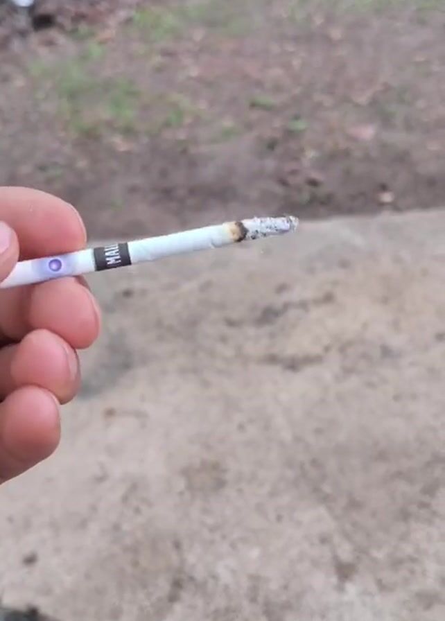 A person is holding a burning cigarette in their hand