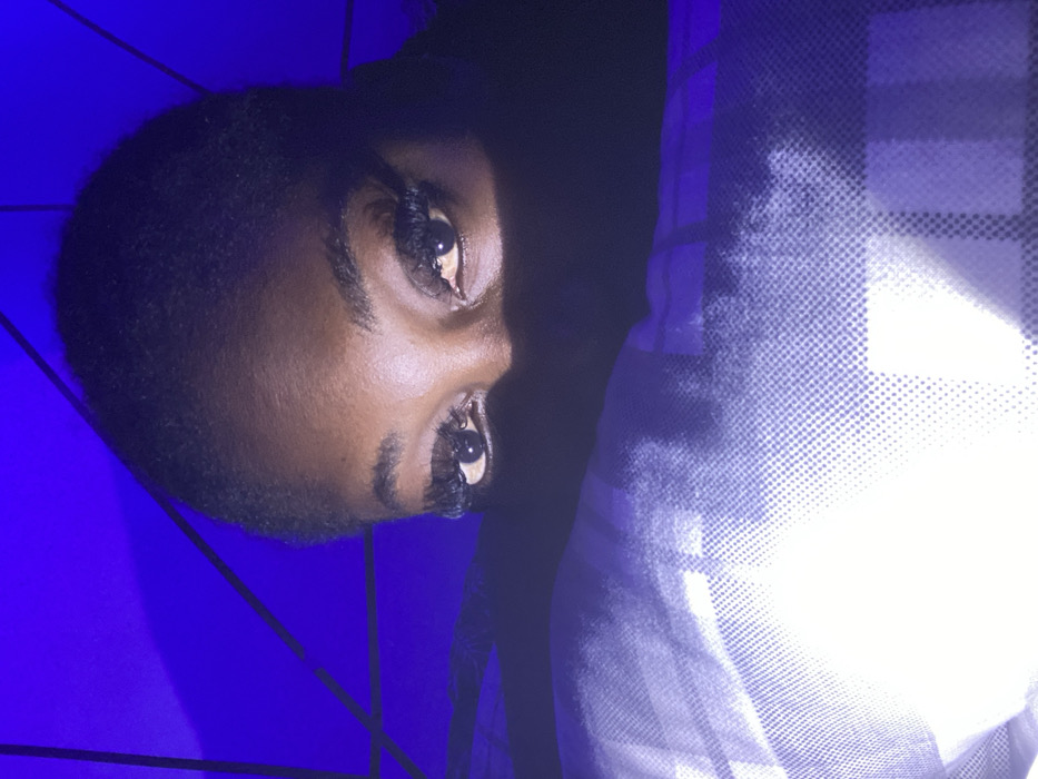 An upside-down close-up features a person's head, face in profile, and partial shoulder, framed by vibrant blue hues. The person has dark skin, short hair, and striking eyes adorned with lashes. A garment, seemingly a patterned white shirt, occupies the right portion of the frame. Light pours onto the right side of the shirt, highlighting its texture. The image's orientation and lighting create a unique, almost surreal aesthetic.