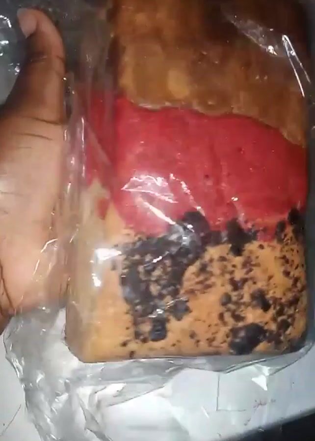 A hand holds a cake loaf in a plastic bag. The cake has three layers: a top layer that's brown, a middle layer that's red, and a bottom layer that's speckled brown and black. The loaf is centered and takes up most of the frame. The background is blurred and indistinct.