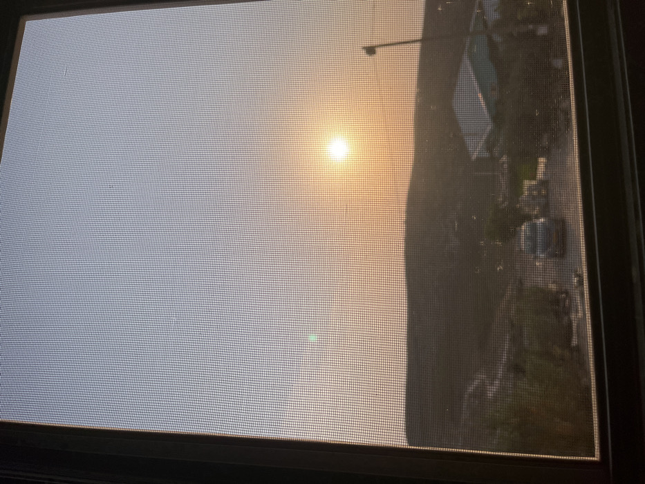 The image depicts an outdoor scene viewed through a window screen, framed by a dark window casing. The time of day is late afternoon or early evening, evidenced by the sun positioned low on the horizon, emitting a bright, yellowish-white light in the middle-right quadrant. The sky transitions from a pale blue at the top to a warm orange and yellow gradient near the horizon. A faint green lens flare is present in the upper-left area. In the midground, a landscape of rolling hills or mountains dominates, appearing dark green and brown due to backlighting. Below the hills, visible through the mesh screen, are signs of human habitation. A dark-colored vehicle, possibly a minivan or SUV, is parked on a paved surface in the lower-left. To its right, a light-colored building with a peaked or corrugated roof structure is visible. A street light pole with a dark fixture is present on the right edge of the frame, extending upwards from the lower-right. A winding road or path is discernible on the left side of the midground. No individuals or explicit actions are observed. The scene is located in an unspecified area within the city of Unknown, Palestinian Territory.