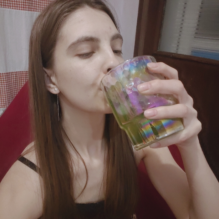 The scene, located in the city of Dubovka, Kazakhstan, depicts a single female subject in an indoor setting. The subject, with long brown hair, is shown in a three-quarter profile, facing right, with her head tilted downwards. She is drinking from a textured, iridescent glass that reflects various colors, holding it to her mouth with her right hand. The glass contains a yellowish-green liquid. The subject is wearing a black-strapped top. A star-shaped earring with a thin silver chain dangle is visible on her left ear. The background to the left features a solid red surface adjacent to a white and red checkered pattern. To the right, a dark brown panel is present, with indistinct lighter objects visible behind the glass.