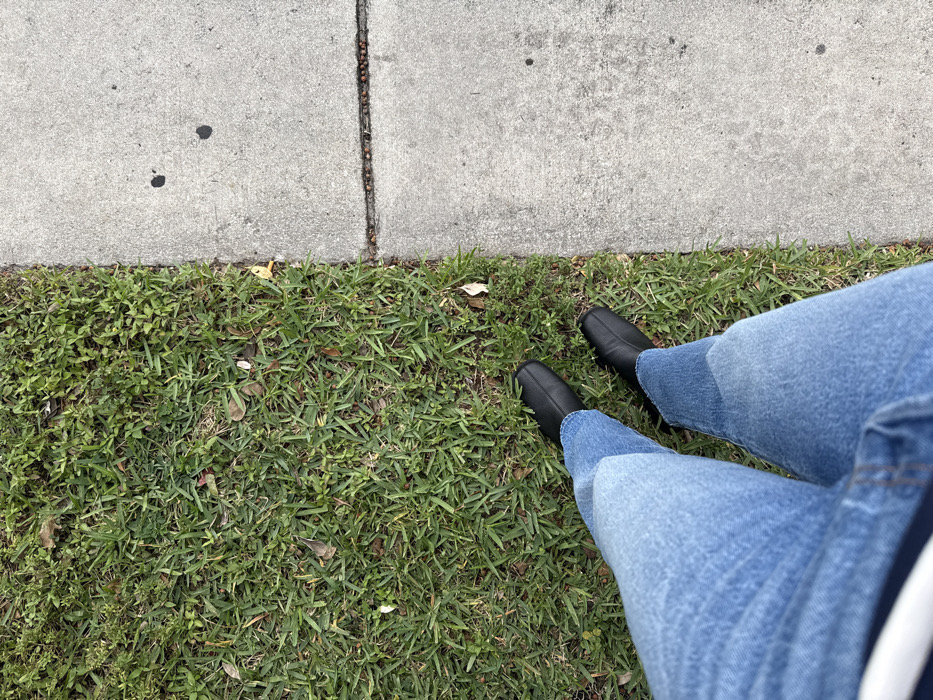 A top-down perspective shows a person standing on grass next to a sidewalk. The person is wearing light-wash jeans with a contrasting color block and black, square-toe boots. The grass is mostly green, with some patches of small-leafed plants mixed in. The concrete sidewalk is gray, and a few dark spots are visible on its surface.