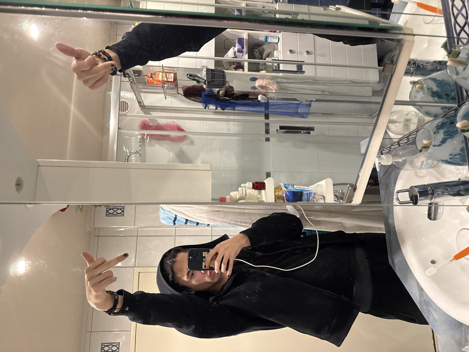 The image displays a mirror selfie taken within a domestic bathroom in Les Ulis, France. A single individual, visible from the mid-thigh up, is reflected in a rectangular wall-mounted mirror above a sink. The person has dark braided hair, dark eyes, and is wearing a black hooded zip-up jacket over a black shirt and black trousers. Dark nail polish is present on all visible fingernails. Multiple beaded bracelets adorn both wrists. The person's reflected right hand holds a dark-colored smartphone, directed towards the mirror to capture the image. This hand also exhibits two fingers (index and middle) extended downwards, with other fingers curled into the palm. The reflected left hand is raised in a "thumbs up" gesture. A white earbud cord is visible near the reflected left ear. The person's lips appear to have dark coloring. The immediate foreground, at the bottom of the mirror, shows a white ceramic sink with a chrome faucet. On the patterned blue and white sink counter, a white pump dispenser containing light blue liquid and a blue and white patterned tumbler holding an orange and a white toothbrush are visible. The background, reflected in the mirror, reveals a tiled bathroom environment. The walls are predominantly light-colored (white or light blue) with scattered square decorative tiles featuring a blue and white geometric pattern. A transparent glass shower enclosure with a chrome showerhead and fixtures is present. Inside the shower, a red mesh body scrub hangs. To the left of the shower, a white towel with blue stripes hangs, and a wall-mounted multi-tiered white shelf unit holds various personal care products, including bottles and a red dropper bottle. To the right of the shower, a white vanity unit with drawers and a mirror-fronted cabinet stores additional toiletries. A metal shower caddy with bottles, a dark mesh body scrub, a blue mesh body scrub, and a light pink scrunchie are suspended from the shower enclosure. Overhead ceiling lights are reflected in the mirror.