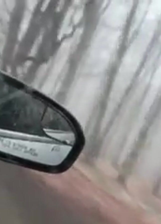 The video, shot from inside a moving vehicle, shows a road surrounded by trees