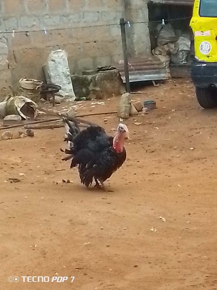 A turkey stands on a sandy, reddish-brown surface outdoors. The turkey is mostly black with a bare, red head and neck. Behind it, there's a building with a concrete block wall and various objects scattered around including bags, a metal wheel, and what appears to be a vehicle. The vehicle has a yellow exterior and the number "70" visible. Some items are covered with some white cloth-like things. A wire runs across the wall.