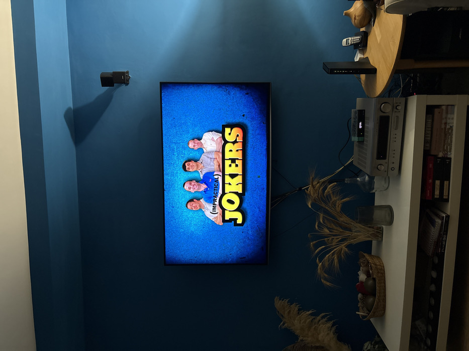 A blue wall houses a TV displaying "Impractical Jokers