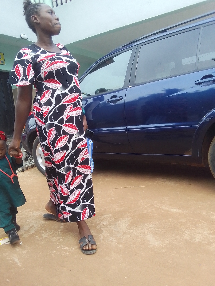 woman in a black, red, and white floral print dress, standing on a dirt surface in Ukwu-Abwa, Nigeria. She is wearing black sandals and is holding the hand of a small child dressed in green traditional attire. A dark blue SUV is parked behind them. The environment appears to be residential, with a building visible in the background.