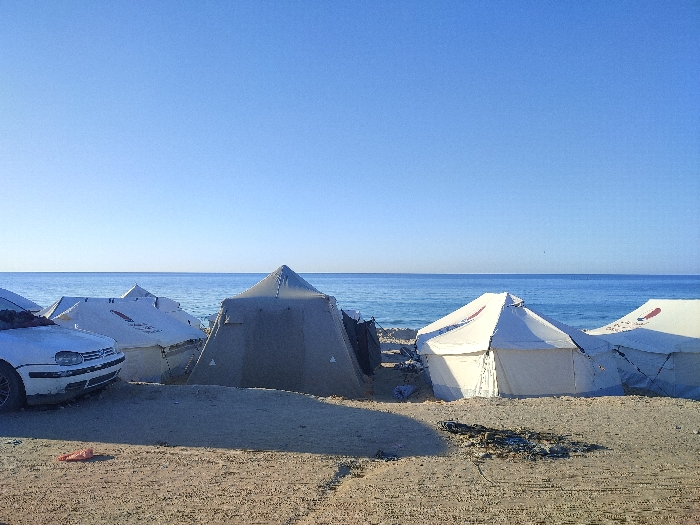 The image displays a temporary encampment on a sandy beach under a clear, pale blue sky