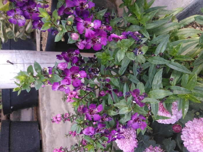 The image displays a close-up of various flowering plants within what appears to be a nursery or garden environment in Los Teques, Venezuela. The foreground and midground are dominated by a plant featuring numerous vibrant purple flowers, identified as Angelonia, characterized by small, multi-lobed petals and darker central markings, surrounded by ovate green leaves. To the lower left, a cluster of light pink, dahlia or chrysanthemum-like flowers, some fully bloomed and others in bud form, are visible with their darker green foliage. In the background, a vertical, light-colored wooden post stands slightly right of center, with a single metal nail partially embedded near its top. Beyond the plants, several out-of-focus dark-colored plant pots are arranged on a grey concrete or paved surface. No individuals or actions are depicted.
