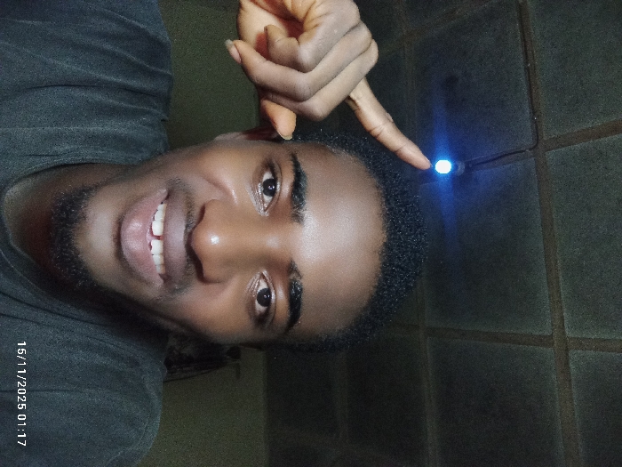 A close-up shot shows a smiling man with dark hair and a short beard. He is wearing a dark grey sweater. His right hand is raised, index finger pointing towards a single, bright blue LED light lying on a dark tiled surface. The perspective is slightly tilted, with the subject appearing on the left side of the frame and the light on the right. The date "15/11/2025" is visible in the bottom left corner.