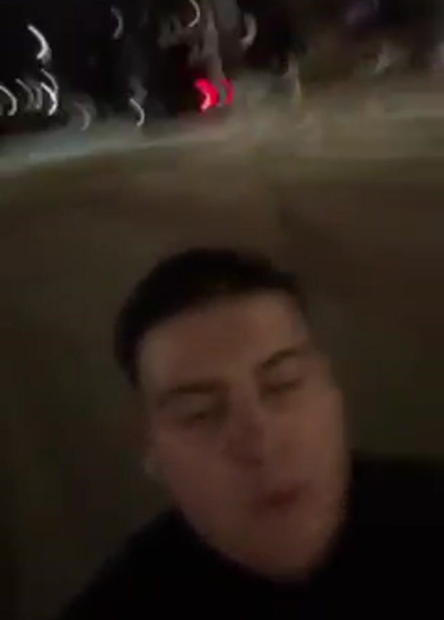 The video features a person with light skin and short dark hair, wearing a dark shirt and white earbuds, walking on a city street at night. The person is holding the camera at a low angle, facing up at their face. In the background, there are streetlights, cars, and indistinct figures. The street appears to be paved and well-lit.