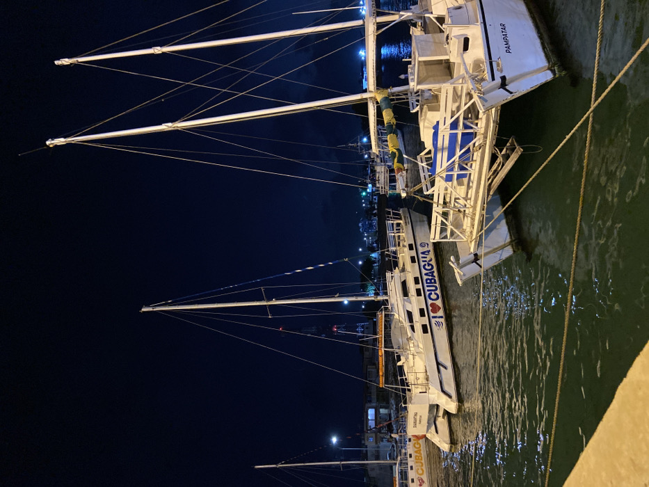 The image depicts a nighttime scene at a harbor in Punta de Piedras, Venezuela. Multiple white catamarans are moored in calm, dark water that reflects artificial lights. In the immediate foreground on the right, the stern of a white catamaran named "PAMPATAR" is visible, with ropes extending towards the unseen dock. A blue object is secured on its deck. Directly behind and to the left, a larger white catamaran, named "DIANARTINA" on its stern, features "I ❤️ CUBAGUA" prominently displayed in blue lettering on its port hull. This vessel has two tall masts with visible rigging and appears to be a passenger catamaran with seating areas. A third, partially visible catamaran on the far left also displays "CUBAGUA." The background shows the distant illuminated shoreline of a town or city, marked by various artificial light sources and structures. The sky is dark and clear. No individuals or specific activities are visible.