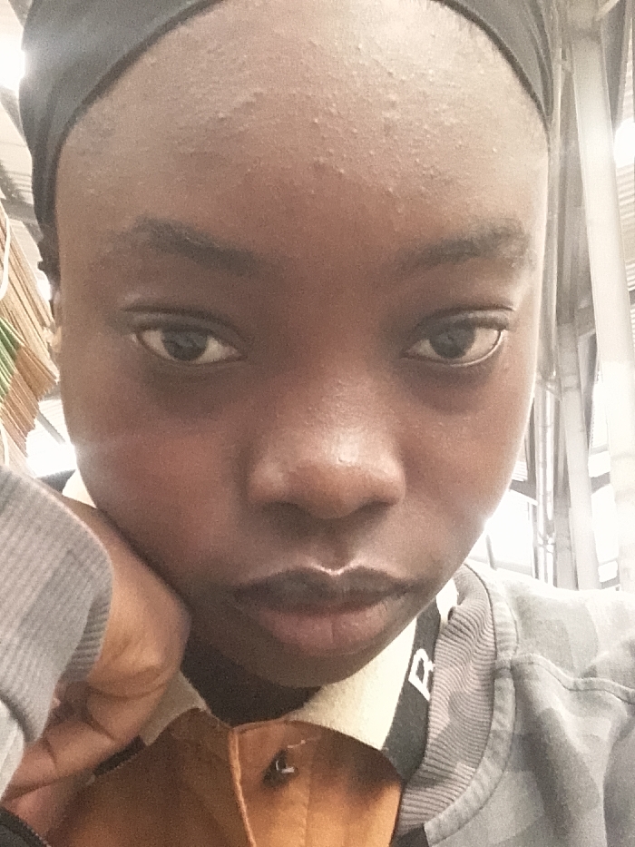 A young individual with dark skin, wearing a black headwrap, is captured in a close-up, head-and-shoulders portrait shot. Their dark eyes are fixed directly on the camera, and their expression is neutral. Small bumps are visible on the forehead. The individual's left hand (viewer's right) supports their chin or jawline. They are dressed in a light-colored collared shirt, partially covered by a grey, possibly striped, jacket with ribbed cuffs. A black strap featuring a white "R" is visible on the right side of the chest. The background suggests an indoor setting; to the left, a stack of light-colored, rectangular items (possibly cardboard or wood) is visible, while the right features blurry vertical and horizontal structural elements, possibly metal beams. The location is Unknown, Unknown.