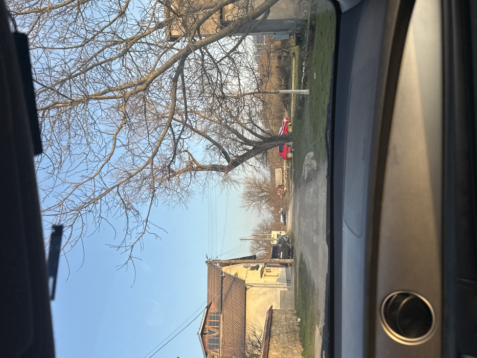 The image presents a view from inside a vehicle looking out onto a street in Parvomaitsi, Bulgaria. The vehicle's dashboard, with a circular vent on the left, occupies the lower frame. A dirt road extends centrally into the distance. On the left, a light-colored two-story house with a brown tiled roof and attic windows is visible behind a stone wall. Power lines traverse the midground. A dark-colored vehicle is parked on the left side of the road near the house. On the right, two large, bare deciduous trees with extensive branches stand over a grassy area where two red vehicles are parked, partially obscured by the trees. A smaller, bare sapling with a white-painted base is situated to the right of the road. In the background, further along the road, indistinct buildings and a large white truck are visible. The sky is clear blue, indicating natural daylight. No individuals are present, and no actions or interactions are depicted.