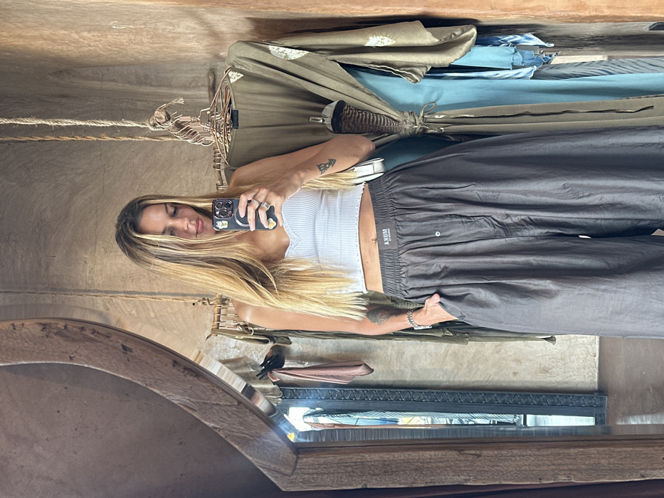 A woman with long blonde hair takes a mirror selfie. She's wearing a white ribbed tank top and baggy gray pants with a visible brand name on the waistband. Clothes hang on a rack behind her, partially obscured by the angle. The mirror frame is ornate and wooden.