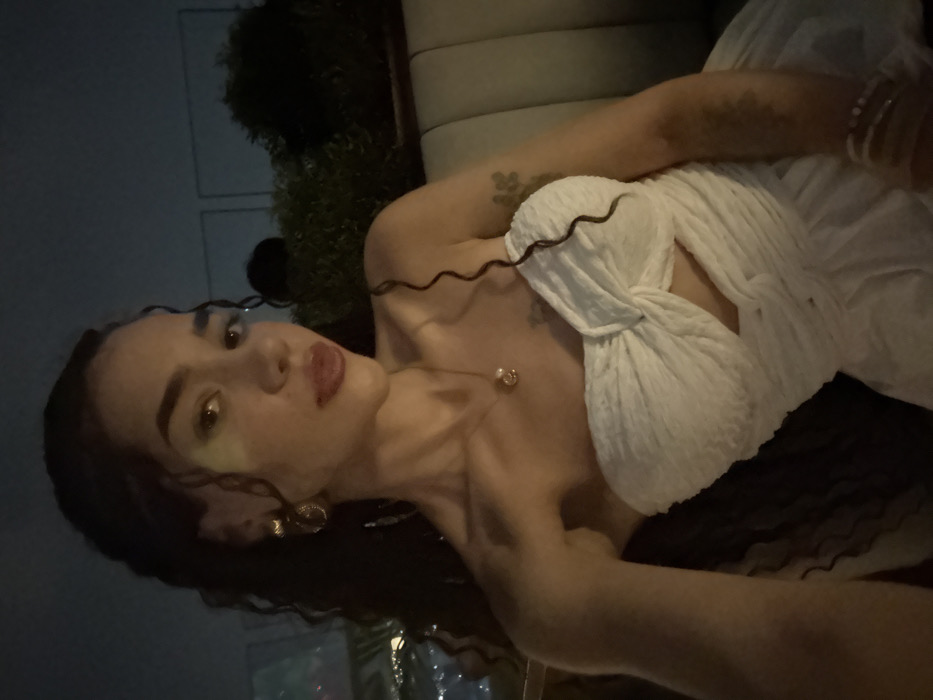 An adult female is depicted in a close-up selfie, seated on a light-colored upholstered bench at an elevated outdoor venue in Bangkok, Thailand, at night. She has long, dark, tightly curled hair cascading over her shoulders. Her face is turned towards the camera, featuring dark eyes, defined eyebrows, and lips colored with a reddish-brown lipstick. Subtle green luminescence is visible near the inner corner of her left eye. She wears a white strapless top or dress, characterized by a textured, possibly ruched, fabric and a prominent knot detail creating a keyhole cutout at the bust. Accessories include gold-toned circular earrings on her left ear, a gold-toned necklace with a spherical pearl-like pendant and a smaller circular charm, and multiple beaded and metallic bracelets on her right wrist. Indistinct dark tattoos are present on her upper left arm and right forearm. The background features a dark night sky over blurred city lights on the left and dark green foliage on the right, confirming an outdoor, high-altitude setting.