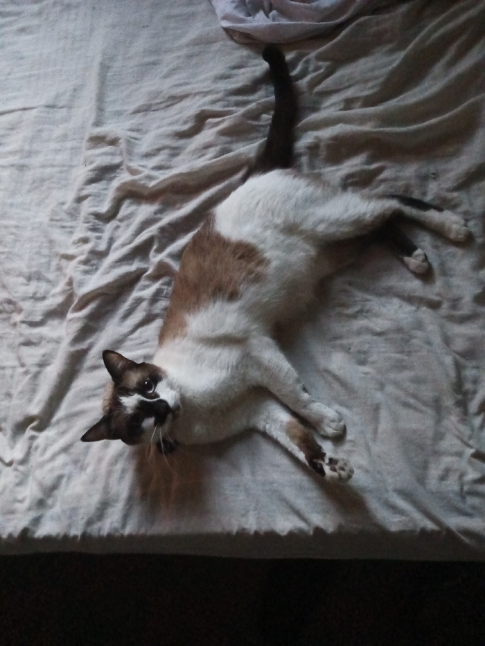 - "A domestic cat, exhibiting a seal point coloration with predominantly white fur, light brown/ginger patches on its back, and dark brown markings on its face (mask), ears, tail, and paws, is positioned on a bed" by FM-aSXAC2, licensed under CC BY 4.0
