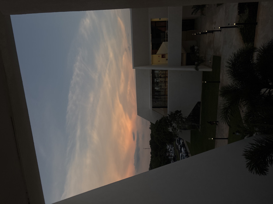 The image displays an architectural exterior scene at dusk in Chablekal, Mexico, viewed from an elevated perspective. The sky above transitions from orange and pink at the horizon to light blue overhead, featuring scattered cirrus clouds. Two stark white, angular architectural structures frame the view, with a sloped wall on the left and a vertical wall on the right. In the mid-ground, a modern, multi-story white building with large windows and sharp geometric lines is prominent. The windows reflect the ambient light and reveal illuminated interior spaces, including a visible staircase. A landscaped lawn area stretches in front of this building, containing small trees and shrubs. A paved pathway runs through the lawn, delineated by multiple illuminated bollard lights. One individual, dressed in dark clothing, is seen walking left-to-right on this pathway. A second, less distinct person is visible on the lawn further back. To the left of the central building, a parking lot contains numerous parked vehicles. A dense treeline forms the background horizon, with a communication tower faintly visible above it. Dark foliage, likely palm fronds, occupies the immediate lower foreground.