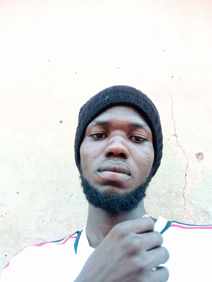 A young man with dark skin and a black knit cap is looking directly at the camera. He has a short, dark beard and is wearing a white shirt with red and blue stripes on the shoulders. The background is a textured, off-white wall with some cracks. His hand is slightly visible, partially obscuring his shirt. The lighting appears to be natural and soft.