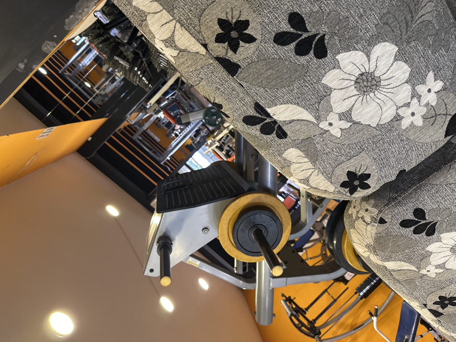 The image displays an interior scene of a fitness facility located in Kyustendil, Bulgaria, captured from an approximate 45-degree counter-clockwise rotated angle. In the foreground, on the right side, a section of grey fabric upholstery with a white, light grey, and black floral pattern is visible, consistent with a couch or chair. To the left and center of the frame, a grey leg press machine is positioned. It features a black, ribbed footplate and a weight stack system. One large yellow circular weight plate is loaded onto a bar, topped with a smaller black 5kg weight plate. Gold-colored cylindrical caps are present at the end of the weight bar and on a separate bar above the footplate. Further left and in the midground, parts of other exercise equipment are discernable, including elements resembling a stationary bike with a blue seat. The background reveals additional gym equipment, including weight racks and various machines, appearing less distinct. The facility's walls are characterized by sections of bright orange and dark grey or black. The ceiling, which is light-colored, contains multiple recessed circular lights emitting a warm yellow glow. No individuals are depicted within the scene.