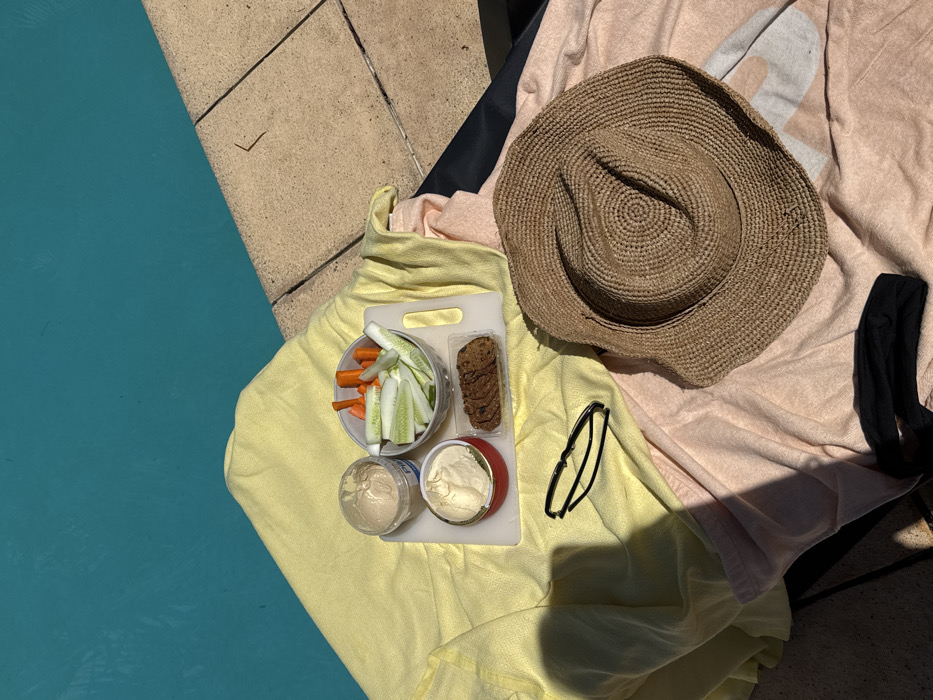 A brown straw hat sits atop a peach-colored towel next to a pair of black glasses and dark fabric. Adjacent is a yellow towel supporting a white cutting board with a container of sliced cucumbers and carrots, a package of cookies, and two open containers of hummus. To the left is a bright blue pool, and beige stone patio slabs are visible in the upper left corner of the frame.