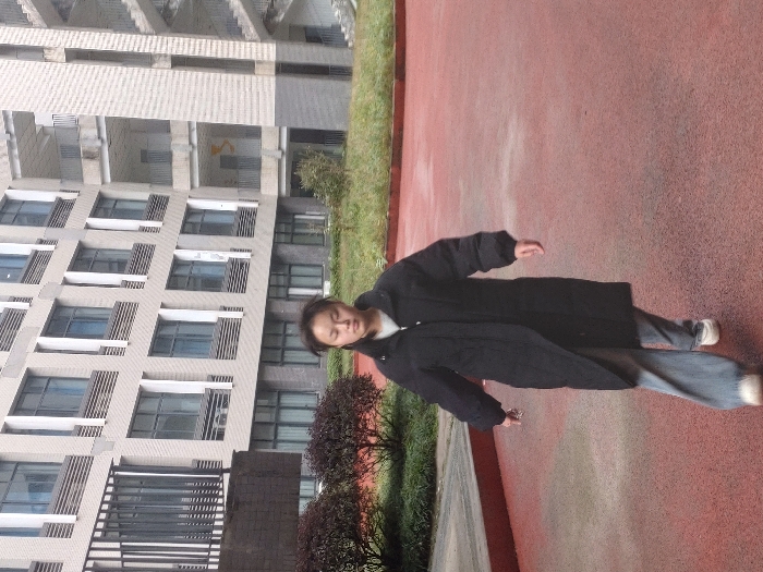 A person in a dark coat and jeans walks on a red surface beside a building. The building, light gray in color, has multiple rows of windows. Greenery, including grass and bushes, separates the walking area from the building's base. The individual appears to be moving parallel to the structure.