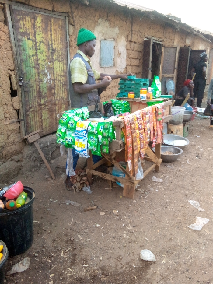 A man wearing a green hat and vest stands behind a wooden stall laden with packaged goods, including laundry detergent and snacks. He appears to be arranging items or serving a customer. The stall is set up outside a building with a rustic, possibly mud-brick exterior and rusty metal door. Other people and items, such as bowls and a trash can with drinks, are visible in the background, suggesting a simple outdoor marketplace.