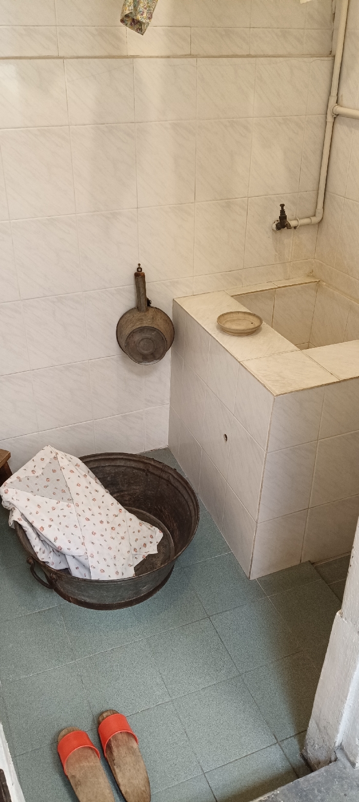 A vintage washroom features tiled walls and floor. An aged metal washbasin with a floral-patterned cloth sits near a built-in tub with a faucet. A weathered metal scoop hangs on the wall above the basin. A small, circular dish rests on the edge of the tub. Red and brown wooden clogs are on the floor.