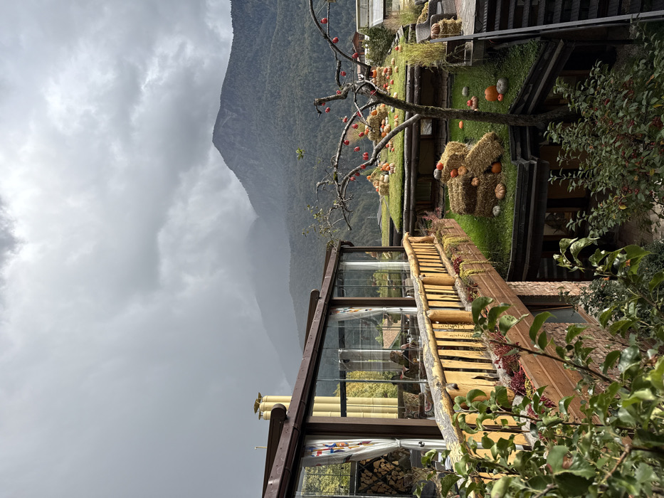 This detailed image captures an autumnal scene in Krasnaya Polyana, Russia, under an overcast sky with mountains partially shrouded in mist. The foreground features green foliage, revealing a multi-level architectural complex. An upper-level structure, likely a restaurant or solarium, presents a long, glass-enclosed facade with brown roof and window frames. A rustic wooden railing, constructed from logs, runs along its exterior, with planter boxes containing trailing plants attached beneath it. Inside, light-colored curtains with distinct patterns are visible, along with a stack of firewood. Two golden-toned cylindrical chimneys protrude from the roofline. Below this structure, a lower-level building features a large, flat, grass-covered roof acting as an open-air decorative space. This green roof is extensively adorned with numerous pumpkins of various sizes and colors (orange, white, green), along with several rectangular hay bales, some stacked to form small displays. A prominent deciduous tree, mostly bare of leaves, stands in this area, its branches laden with numerous small, spherical red fruit-like objects or ornaments. To the right, dark-colored steps descend, and tall ornamental grasses are visible in planters. No individuals are present or discernible within the scene. The distant mountains are densely forested, appearing dark green under the heavy cloud cover.