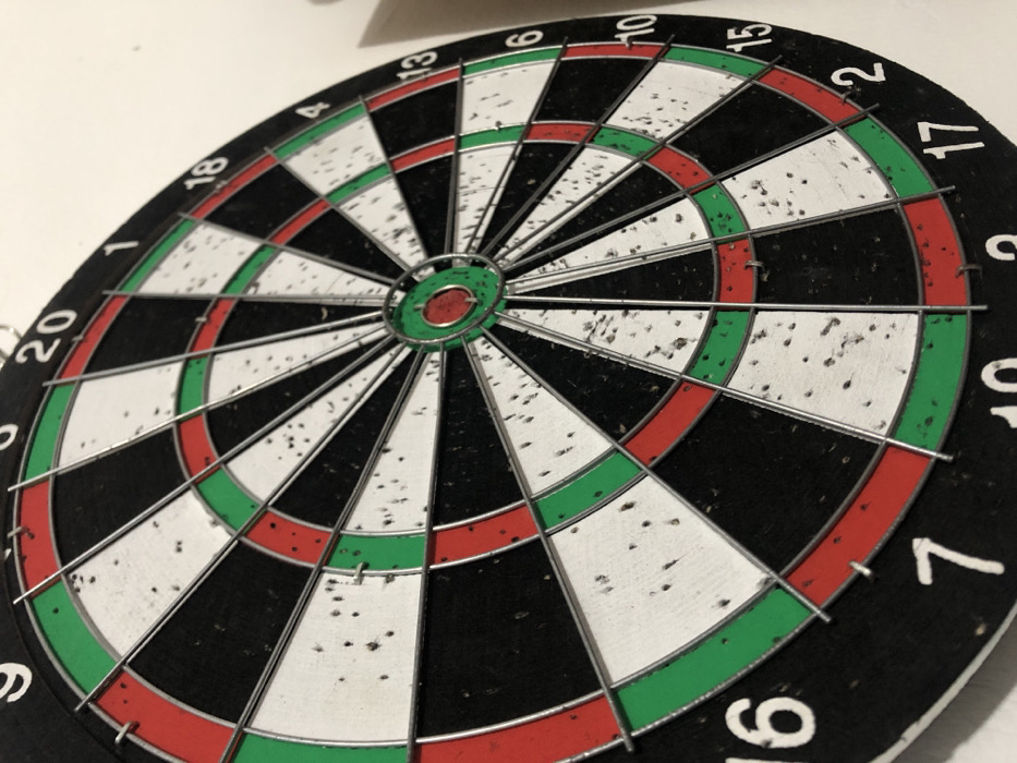 - "This image displays a standard circular dartboard, situated in Ciherang, Indonesia, mounted against a plain, light-colored vertical wall" by FM-aA4dB2, licensed under CC BY 4.0